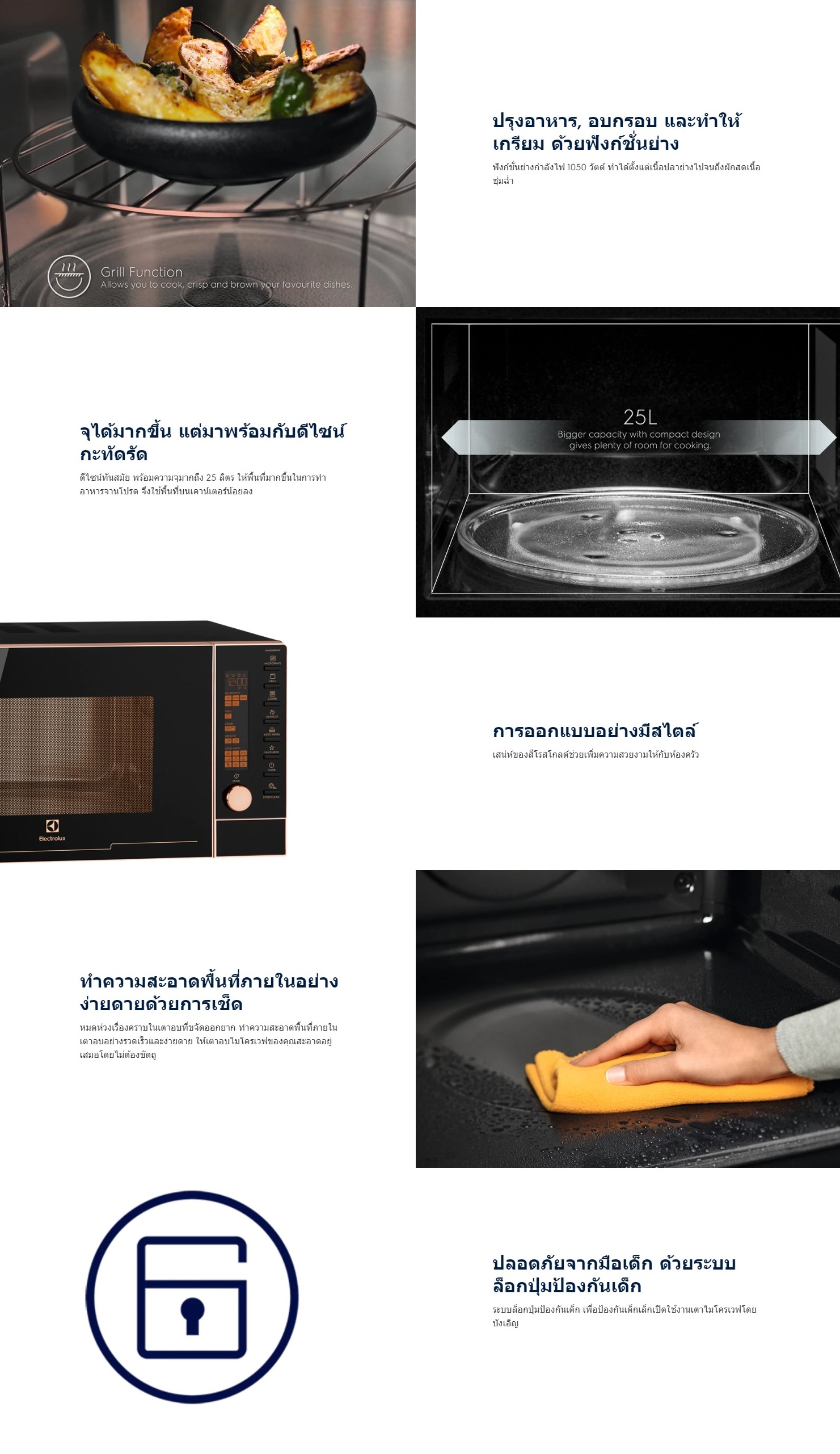 ไมโครเวฟระบบย่าง ELECTROLUX EMG25D89GGP 25 ลิตรเตาไมโครเวฟ Electrolux แบบ 2 ฟังก์ชันในหนึ่งเดียว ที่รวมทั้งเตาไมโครเวฟและเตาย่าง เพื่อรสชาติอาหารที่ดีที่สุด และความสะดวกสบายของคุณ ทำได้ทั้งปรุงอาหาร, อบกรอบ, ย่างเนื้อสัตว์ให้เกรียม และนุ่มน่าทาน, ย่างเนื้อปลาให้นุ่มชุ่มฉ่ำ, เนื้อผักสีสันน่าทาน และอีกหลากหลายอย่างได้แบบไม่ยุ่งยาก ฟังก์ชันย่างจะช่วยให้เตาไมโครเวฟของคุณทำได้มากกว่าแค่อุ่นอาหาร, ทำให้ร้อน หรือช่วยทำละลาย