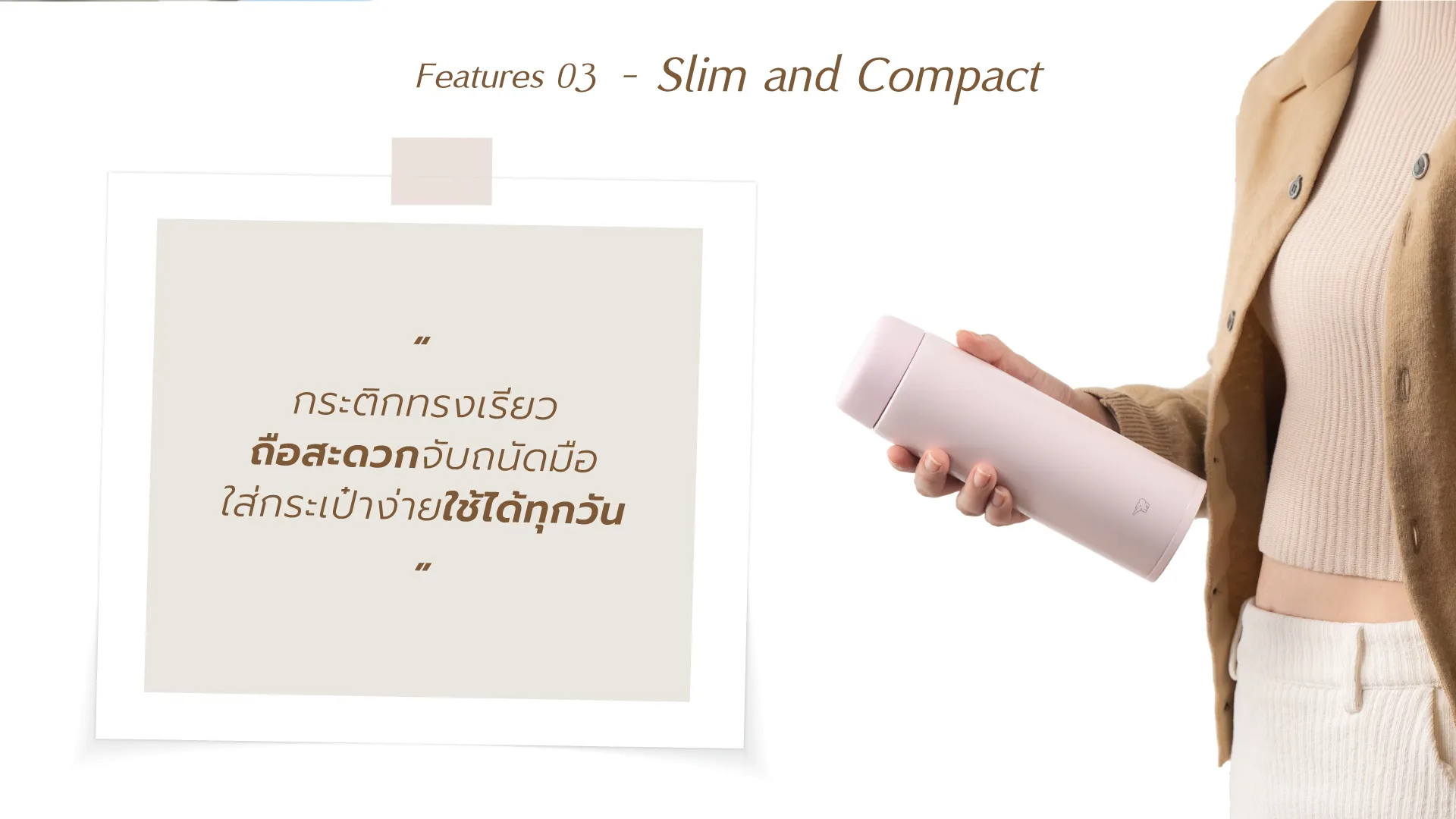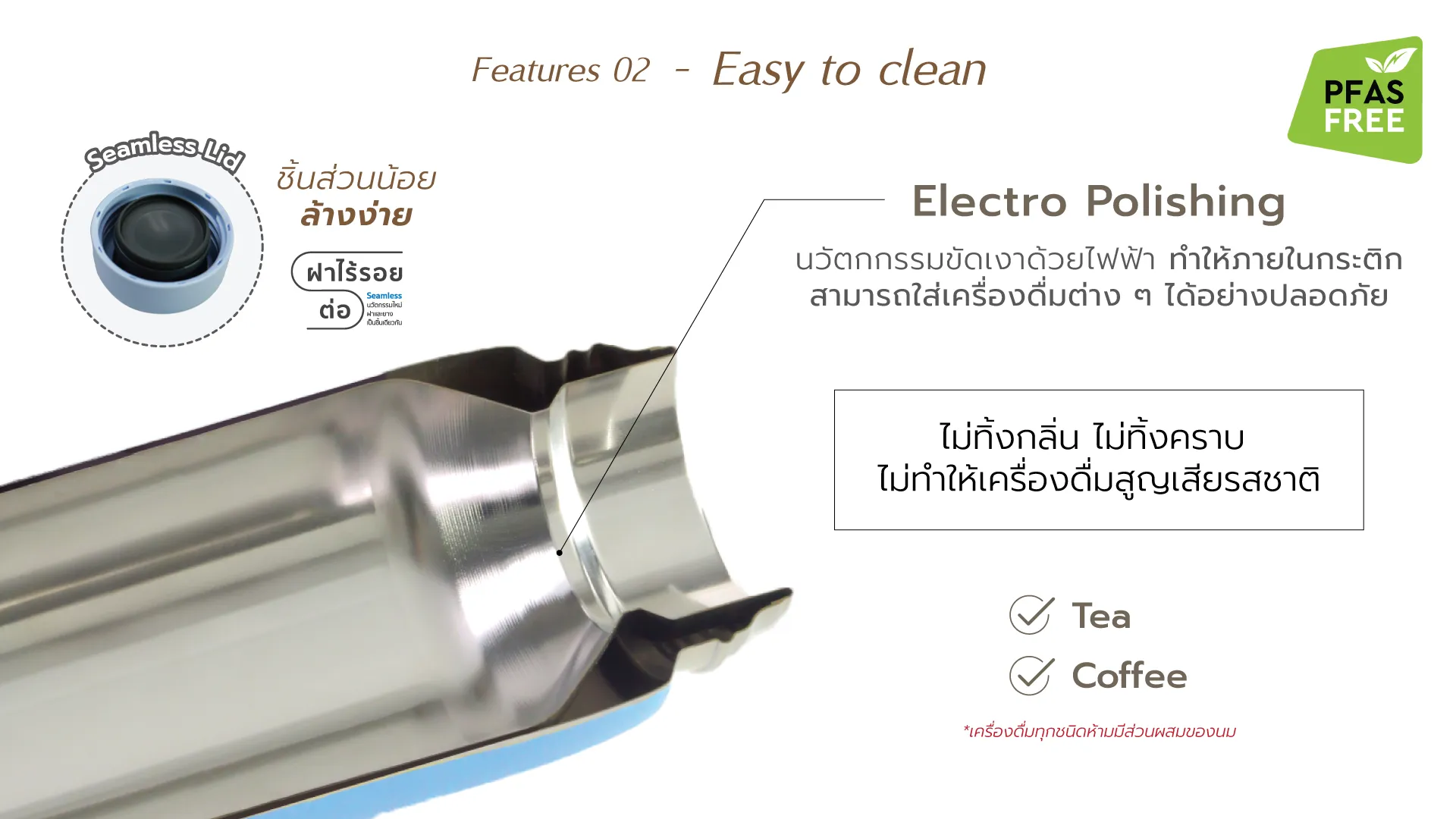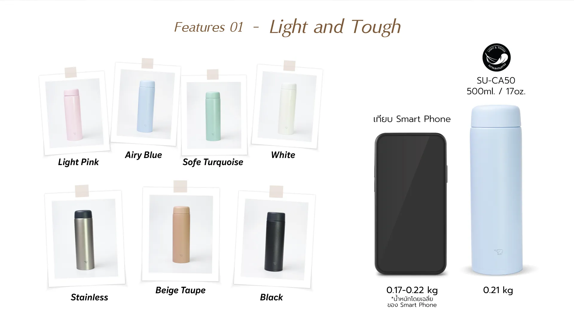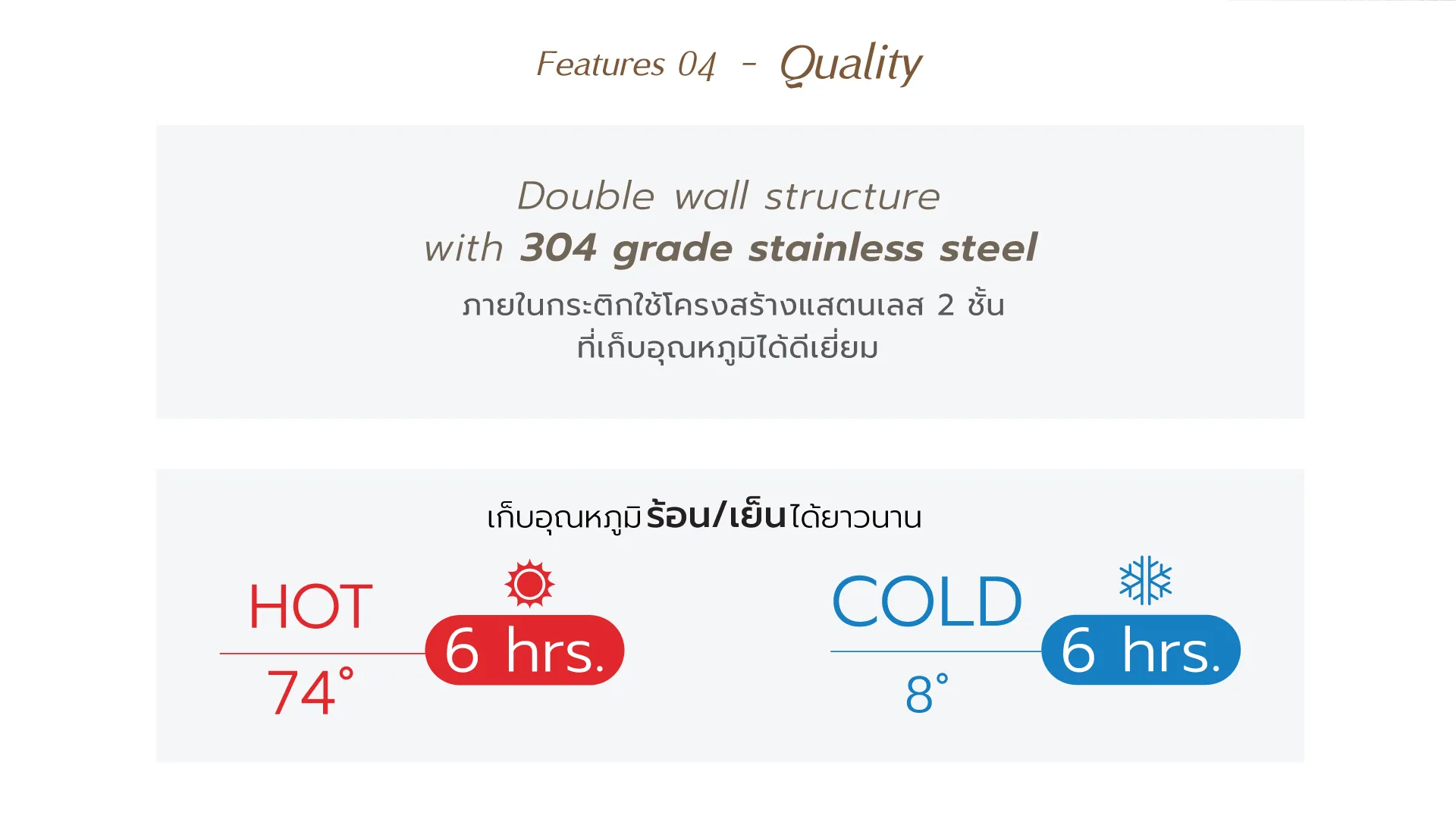 ผลิตจากสเตนเลส 304 โครงสร้าง 2 ชั้น (Double Wall) เก็บรักษาอุณหภูมิได้นานถึง 6 ชม. ทั้งน้ำร้อน (74 องศา) และน้ำเย็น (8 องศา) ตัวกระติกบางเพียง 1 มม. ด้วยเทคนิคการผลิตเฉพาะ ทำให้มีน้ำหนักเบา กะทัดรัด และพกพาสะดวกไปได้ทุกที่ ฝาปิดระบบ Seamless Lid ไร้รอยต่อระหว่างซีลยางและฝา ลดชิ้นส่วนที่ต้องถอดล้างเหลือเพียง 2 ชิ้น ออกแบบปากกระติกให้กว้างสามารถยกดื่มได้โดยตรง พร้อมโครงสร้างที่ป้องกันการเกิดไอน้ำเกาะรอบแก้ว